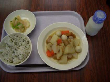 今日の献立は、菜めし、牛乳、洋風おでん、かぶのレモンしょうゆかけです。