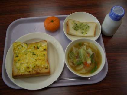 今日の献立は、たまごトースト、牛乳、白いいんげんの田舎風スープ、くだものです。