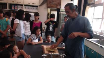 紙がどのようにできるのか、細かい工程を教えていただき、実際に皮をむいたり、ちりとりをしたり、原料となる繊維を細かくたたいたりしました。「和紙をすいているときの音に耳をすませてごらん」「繊維をたたくときには歌のリズムに合わせてリズムよく叩くといいよ。」と一つ一つ丁寧に教えていただきました。