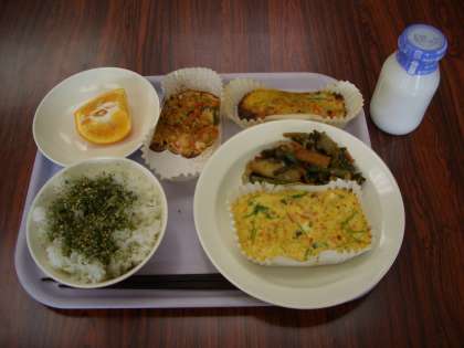 今日の献立は、ごはん、ふりかけ、牛乳、千草焼き、くきわかめのきんぴら、くだものです。今日は、アレルギー対応食を2種類、調理員さんが調理してくれました。どの子どもも安心しておいしくいただくことができます。