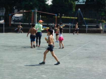 3年生は、学級活動として水鉄砲大会を行いました。子どもたちは自宅から思い思いの水鉄砲を持てきました。全力で走り、楽しむ姿が校庭のあちらこちらで見られました。