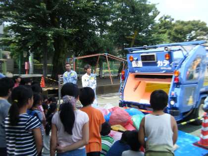 教室での学習の後は、校庭へ出て、子どもたちの学習用ゴミ収集車「カティ」を使って実際に収集車にゴミが回収される様子を見学しました。子どもたちは、実際に作業時に着用しているヘルメットや軍手、長靴をはいて、作業の一過程を体験しました。