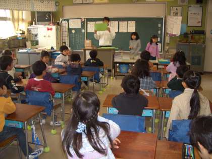 1年生の教室では、“子どもの読書カード”・・・1年生では、家で読んだ本をカードに書いています。家庭読書を紹介を担任の先生がしていました。聞いている子ども達から、自然に拍手がわきあがっていました。いい雰囲気です!