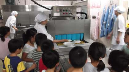 夏休みに給食室は大掃除をするので、その前に1年生は給食室を見学しました。