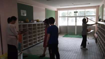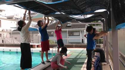先日、教員と学校主事さんでプールの日差しつけやプールの受付準備を致しました。