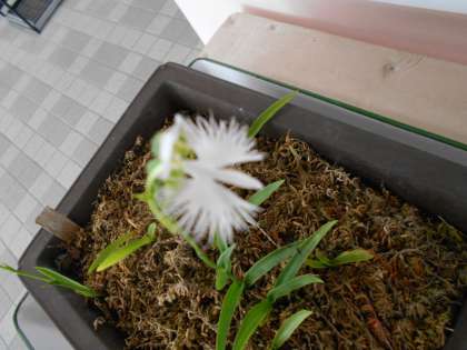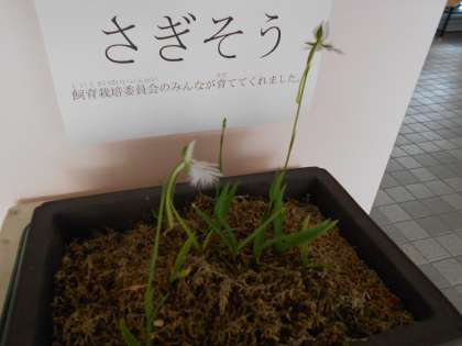 飼育栽培委員会の子どもたちが、地域の金子さんにご指導をいただき育てているさぎそうの花が咲きました。学校の玄関にありますので、ご来校の際にご覧ください。さぎそうの花の開花期間は短いです。