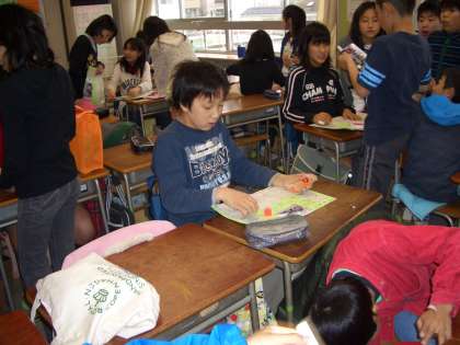 5年生の教室では、“明日の6年生を送る会のプレゼント作り”を先生が来る前の時間を活用して行っていました。