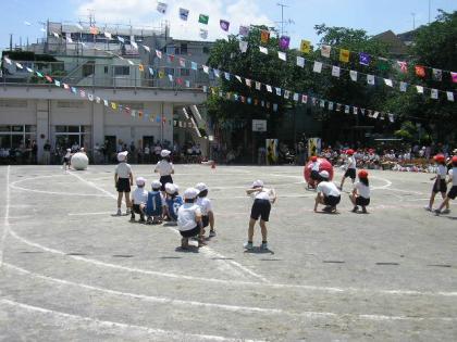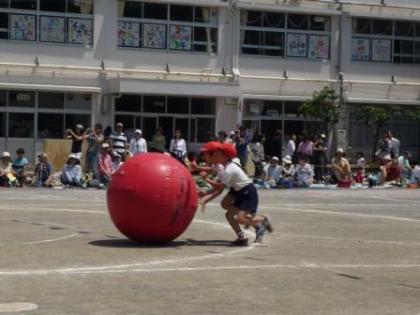 大きな声援がおくられた「大玉ころがし」(写真;中・右)。自分の体よりも大きな玉を力一杯転がしました。