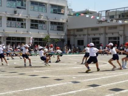 4年生「おっかけつなとり」(写真;中)。5本の綱をみんなで協力して自軍へと運びます。最後の一本はみんなの力を結集しての総力戦となりました。