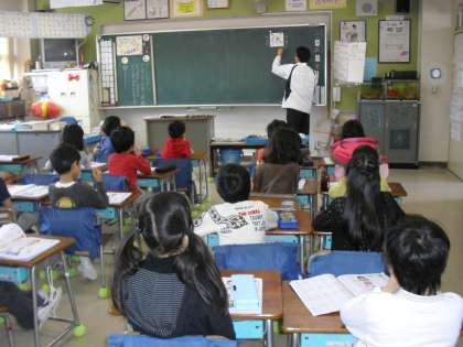 1年生の教室では、“国語科:漢字指導”“休”という漢字の書き順、読み方、使い方な度、・・・・丁寧に指導していました。子ども達も真剣に聞いていました。