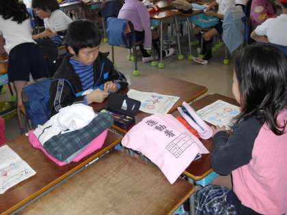 2年生の教室では、“朝 自習:答え合わせ”宿題のプリントの答え合わせを隣の子どもとしている様子です。そのあと、集めて担任指導があります。
