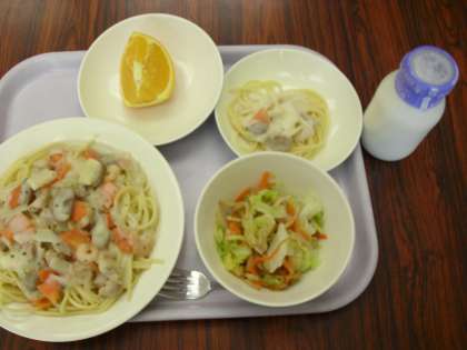 今日の献立は、スパゲティクリームソース、牛乳、ジャガイモのハニーサラダ、くだものです。今日も調理員さんが、アレルギー対応食を調理してくれました。