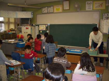 1年生の教室では、“朝の会:提出物確認”係の子どもが自分の班のプリントを集めて 先生に提出していました。