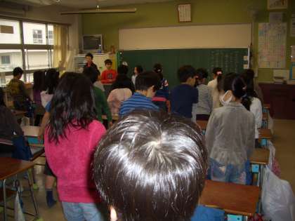 2年生の教室では、“朝の会:朝の歌”テープに合わせて歌っている場面です。