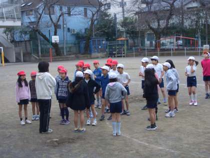3年生は、校庭で“体育科”今日の目当てを先生が伝えている場面です。