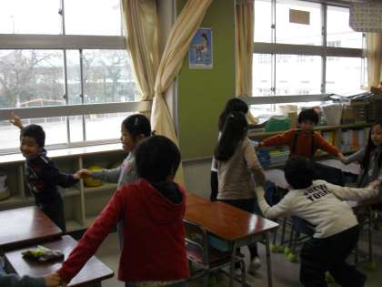 1年生の教室では、“おはよう!握手!の歌で1日がスタート!”しました。みんな元気に先生の指示に従って、手をつないで、大きな輪にしていました。
