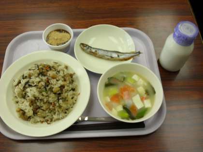 今日の献立rは、豆入りひじきごはん、牛乳、みそ汁、焼きししゃも、黒みつ寒天です。