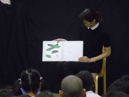 「いっぱいやさいさん」は詩の絵本で、生活科で野菜を育てている2年生は興味をもっていました。野菜といっしょにかかれた小さな虫まで気が付いてよく見ていました。