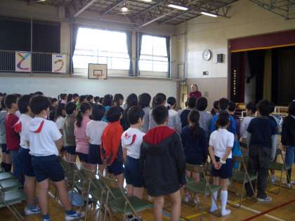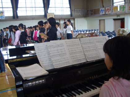 卒業式で歌う指導を行っている場面です。伴奏も子ども代表が行います。