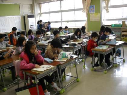 1年生の教室では、“朝 読書タイム”落ち着いて、静かに自分で選んだ本を読んでいます。まもなく2年生です!