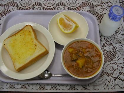 今日のメニューは、ガーリックトースト、牛乳、トマトシチュー、くだものです。