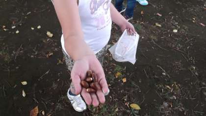 公園には、ドングリやマツボックリ、葉などがたくさん落ちていました。子どもたちは、夏に比べて葉の色が、赤色や黄色に変わっていることに気づくことができました。