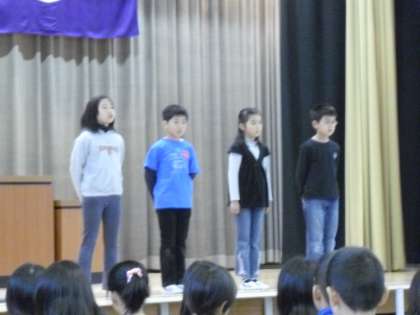 修了式後、生活指導主任の先生から、“春休みの過ごし方について”お話がありました。1年間通して・・・全校児童が集まっての朝会や集会の集合時間、集合の態度も大変立派です。4月各学年が進級した時が楽しみです。