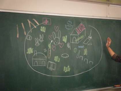 初回は、天気で自分の気持ちを表したり、ウサギを飼うという想定で、ウサギが幸せに暮らすために必要なものを全員で考えたりしました。