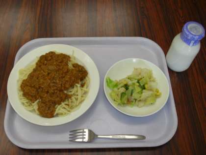 今年度初めての今日う食の献立は、スパゲティミートソース、牛乳、ポテト入りフレンチサラダです。この春人事異動があり、栄養士さん、調理員さんが入れ替わり、新メンバーでの初めての給食です。子どもたちは、楽しみに待っています。