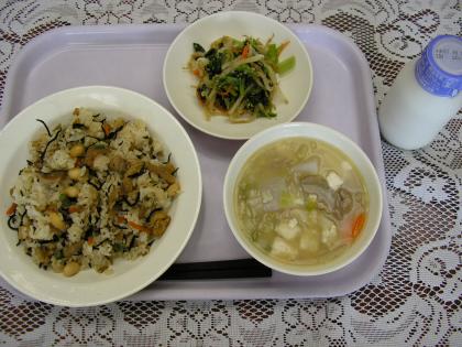 今日のメニューは、豆入りひじきご飯、牛乳、豚汁、野菜のごま和えです。