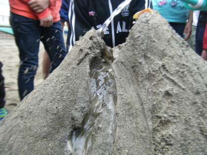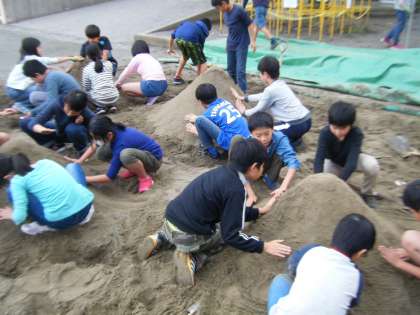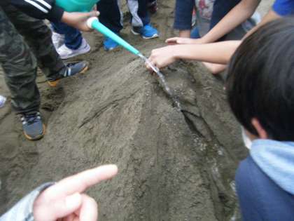 実際に砂場に山をつくって水をながし、けずられているところ、流れが速いところ、砂の動きを視点にして実験しました。
