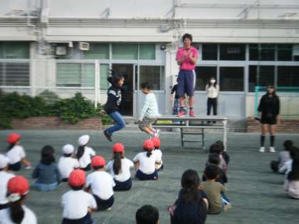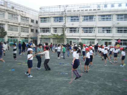 集会委員会の児童が、お手本を見せた後、みんなで取り組みます。一人で跳ぶ楽しさもありますが、今日は友達とかかわり合いながら跳んでいました。みんなで笑顔で楽しそうでした。休み時間も跳んでいました。ぜひ、ご家庭でも取り組んでほしいと思います。