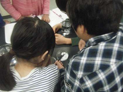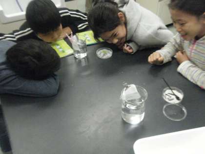「どのように「もの」は水の中でとけるのだろう」という学習問題に対して実験を行い調べました。
