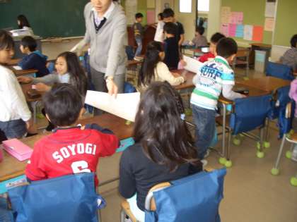 2年生の教室では、“生活科”1年生を学校たんけんんに連れていく準備・計画をたてるところです。各グループになって相談を始める準備・・・・