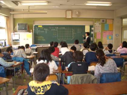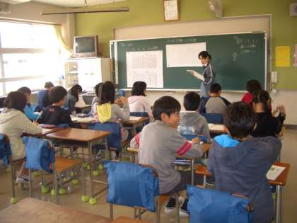 6年生の教室では、“算数の学習:少人数指導”担任の先生と少人数担当の先生と半分に分かれての指導です。“倍数と約数”という学習をしていました。