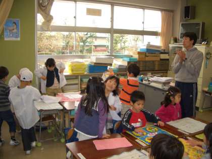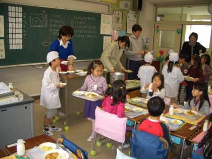 1年生の給食が今日から始まりました。担任の先生の指導のもと・・・初めて、給食当番&牛乳当番をしました。楽しく会食していました。