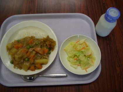 今日の献立は、カレーライス、牛乳、福神漬け、キャベツサラダです。