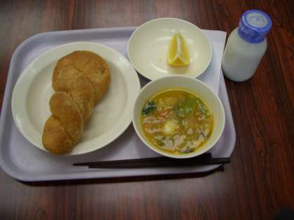 今日の献立は、揚げパン、牛乳、肉団子入り春雨スープ、くだものです。