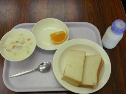 今日の献立は、ジャムパン、牛乳、クリームシチュー、くだものです。