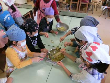育てたサツマイモで茶巾しぼりを作りました。みんなで協力して、イモの皮をむいたり、つぶしたりできました。