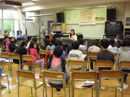 今日から、ニューヨークからの転校生を迎えました。音楽集会後、全校児童に紹介され、大きな拍手で迎えられました。