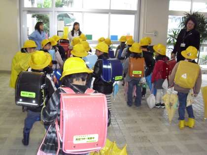 1年生の下校風景です。教室で、担任の先生より下校指導があり、玄関で、コース別に並んで下校です。入学して3週間余りですが、道路の歩行も上手です。
