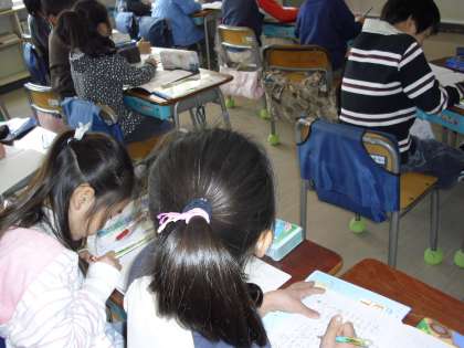 3年生は、“算数の学習:少人数指導”計算の工夫・・・の学習。43+249+57=などの計算の工夫を学習していました。画面は、担任の授業です。