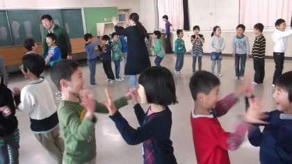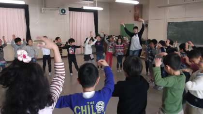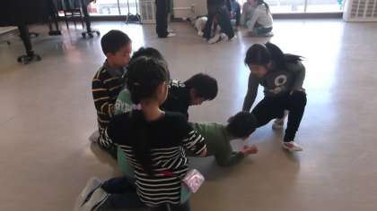 最初に体を動かすゲームをし、そのあとにグループになって表現をすることを学びました。