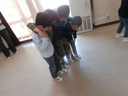 絵本「いっぽんみちをあるいていたら」を読んでもらった後、グループで登場人物を想像してなりきりました。どれも同じようなものはなく、工夫をこらして表現できました。