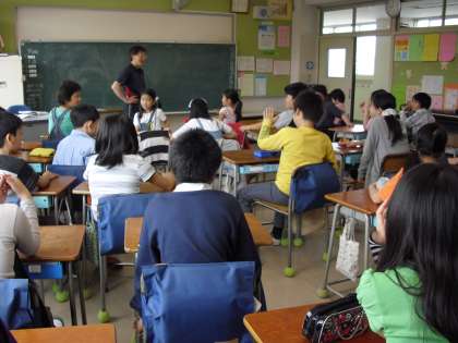 5年生の教室では、健康観察の折りに、連休の過ごし方を聞いていました。子どもの発言に丁寧に答えていました。掲示には、“図工の作品”が掲示されていました。