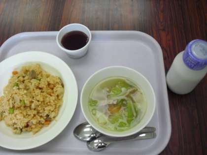 今日の献立は、チキンライス、牛乳、ベーコンと野菜のスープ、ブドウゼリーです。