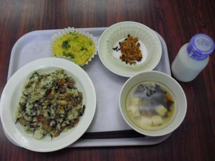 今日の献立は、豆入りひじきごはん、牛乳、すまし汁、卵焼きです。今日もアレルギー対応食を調理員さんが作りました。
