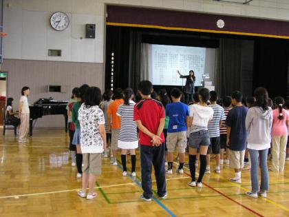 音楽集会で、この時期にぴったりな「にじ」という歌を歌いました。雨上がりの空に架かる虹のように、低学年と高学年の声がきれいなハーモニーになりました。