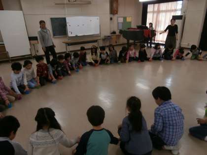 リトミックでは、リズムに合わせて体を動かしたり、拍子をとったりしました。「カップス」というリズムに合わせて、みんなでコップを送っていく活動をしました。40人で合わせるのは大変でしたが、集中して楽しんで取り組めました。